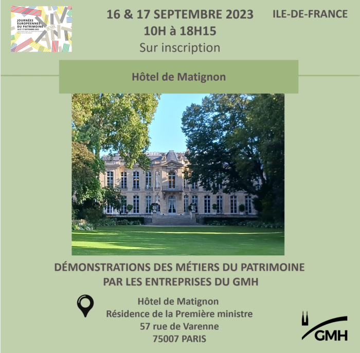 Les adhérents du GMH présenteront leur savoir-faire au public dans le parc de la résidence du Premier ministre : charpentiers, couvreurs, menuisiers, restaurateurs de décors peints, restaurateurs de parquets anciens, restaurateurs de vitraux et tailleurs de pierre.