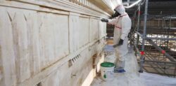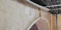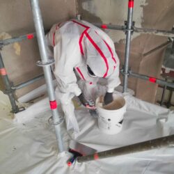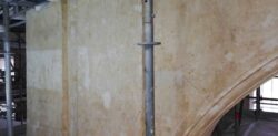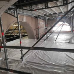 Les murs intérieurs ont été au fil des ans recouverts de différentes couches de peinture. Les diagnostics avant travaux ont permis de constater qu’elles contenaient du plomb. L’entreprise REMOVE, spécialisée en dépollution plomb et amiante, a été choisi par PRADEAU-MORIN MONUMENTS HISTORIQUES, attributaire du marché, pour effectuer le décapage de ces peintures plombées.