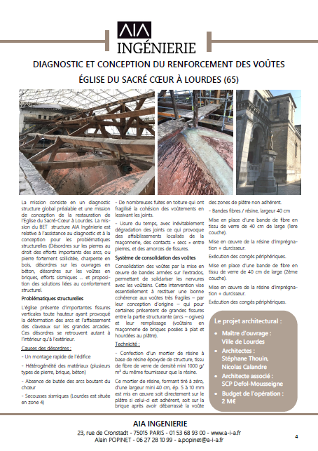 DIAGNOSTIC ET CONCEPTION DU RENFORCEMENT DES VOÛTES, ÉGLISE DU SACRÉ COEUR À LOURDES (65) La mission consiste en un diagnostic structure gl (…)