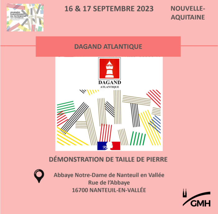 Démonstration de taille de pierre. L’abbaye de Nanteuil en Vallée, dont il reste aujourd’hui une « tour du trésor » du XIIe siècle et « les grands greniers », probablement l’ancienne hôtellerie du XIIIe siècle, est mentionnée dans les textes dès 858.