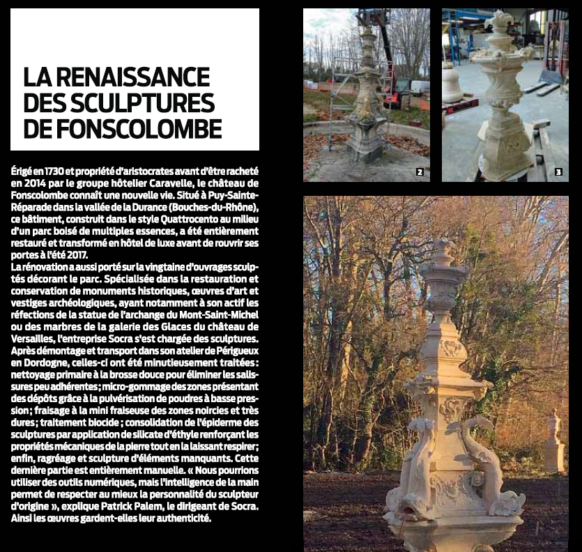 Spécialisée dans la restauration et conservation de monuments historiques, œuvres d’art et vestiges archéologiques, ayant notamment à son actif les réfections de la statue de l’archange du Mont-Saint-Michel ou des marbres de la galerie des Glaces du château de Versailles, l’entreprise Socra s’est chargée des sculptures.