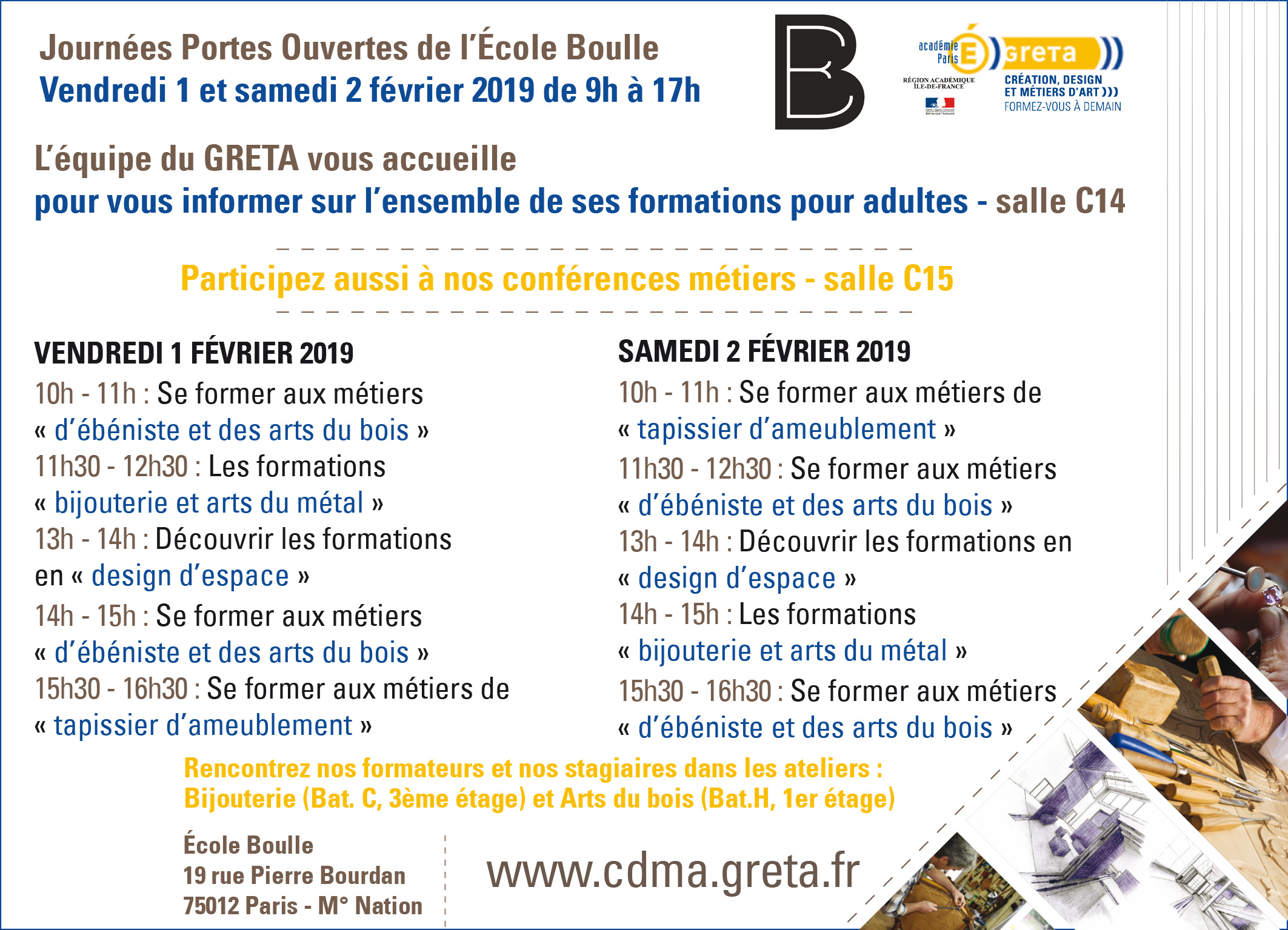 - À l’École Boulle venez visiter les ateliers d’ébénisterie, de restauration, de marqueterie, de bijouterie … et vous renseigner sur nos formations en art du bois, bijouterie, tapisserie d’ameublement et design d’espace. Salle C14 et C15