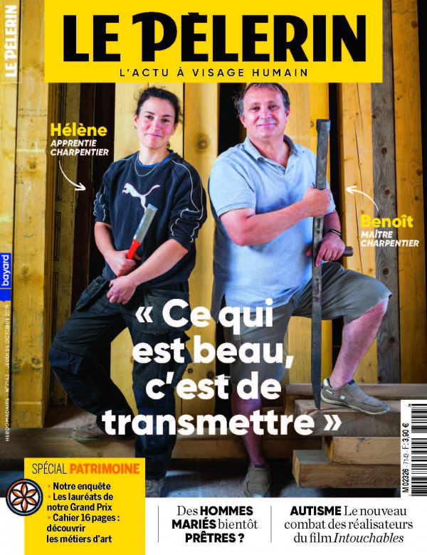 Le GMH en couverture du Pèlerin pour un numéro spécial consacré aux métiers du patrimoine. Avec les portraits des apprentis du GMH : Hélène, apprentie charpentier, Baptiste apprenti maître verrier, Matisse, apprenti ferronnier et Baptiste, apprenti couvreur.