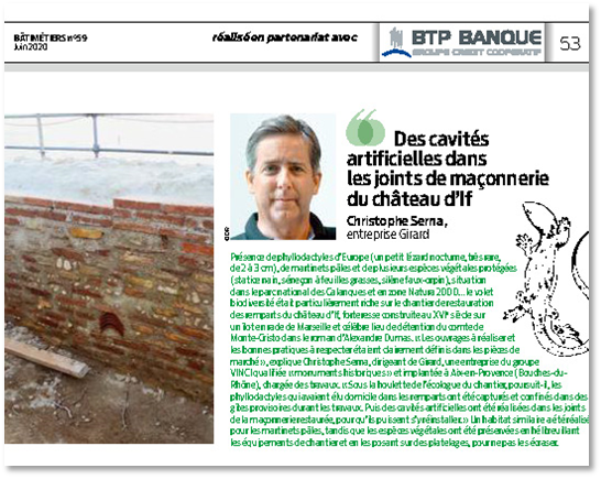 Les chantiers de restauration sont très souvent concernés. Lisez l’aventure du sauvetage des phyllodactyles d’Europe, occupants des remparts du château d’If au large de Marseille, par l’entreprise Girard en charge des travaux.