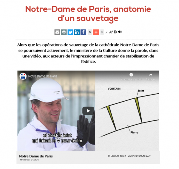 Alors que les opérations de sauvetage de la cathédrale Notre-Dame de Paris se poursuivent activement, le ministère de la Culture donne la parole, dans une vidéo, aux acteurs de l’impressionnant chantier de stabilisation de l’édifice.
