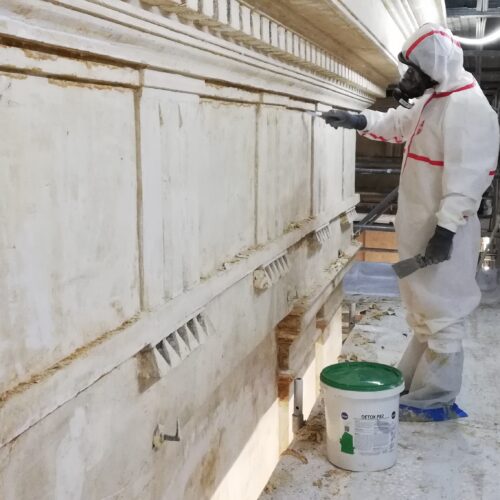 Exemple illustré par le retrait de plomb surfacique et le nettoyage en une action d’une façade en pierres grâce à SOLUROC.